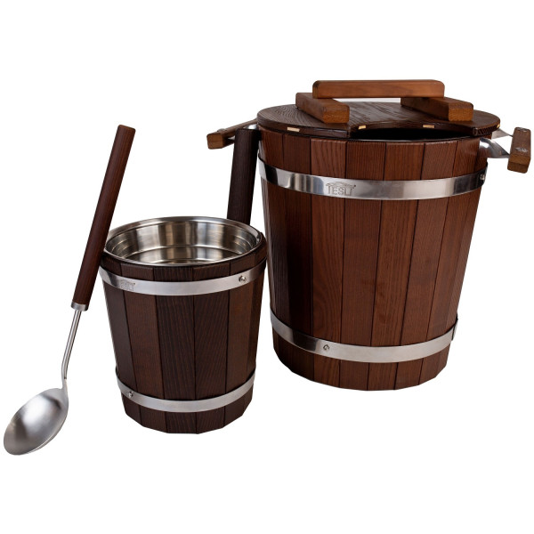 Запарник емкостью 20 л с крышкой и шайка емкостью 5 л изготовлены из термодревесины, и укомплектован и вставками из нержавеющей стали, что значительно упрощает уход за изделиями .