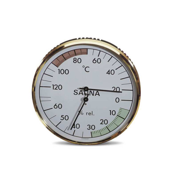 Комби термо-гигрометры для сауны от немецкого производителя EOS Saunatechnik отличаются высоким качеством и длительным сроком службы. Эта модель термо-гигрометра имеет круглую форму Ø 160 мм с креплением на стену. Измерительный прибор изготовлен из пластика, имеет стильный дизайн. Типичный климатический диапазон сауны выделен на шкале цветом.