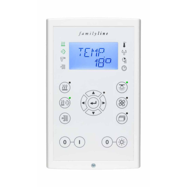 Пульт управления Fasel FCU3000-DESIGN – это современное решение для управления электрокаменками. Благодаря стильному дизайну он отлично сочетается с интерьером любой спа-зоны. В комплекте идут два датчика для максимально точной регуляции температуры. Пульт позволяет откладывать включение или выключение системы, настраивать продолжительность работы, интенсивность вентиляции и яркость освещения. LED-дисплей четко отображает все выбранные настройки, обеспечивая удобное управление.