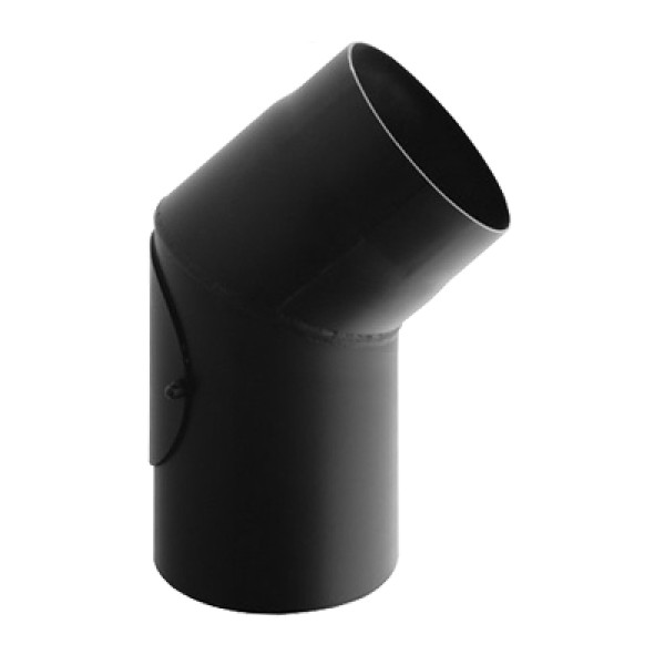Колено с ревизией 45° Ø 150 мм, одностенное, применяется для поворота дымоходной трубы камина или отопительной печи. Изготовлен из черной стали, покрытой слоем термостойкой краски, толщиной 2 мм.