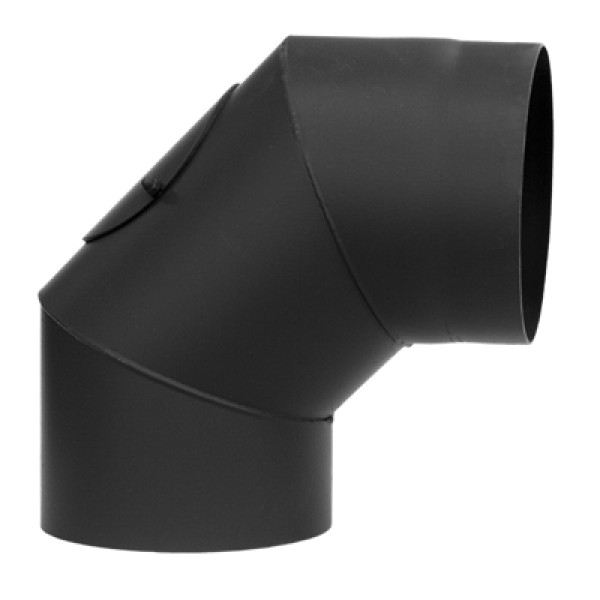Колено с ревизией 90° Ø 150 мм, одностенное, применяется для поворота дымоходной трубы камина или отопительной печи. Изготовлен из черной стали, покрытой слоем термостойкой краски, толщиной 2 мм.