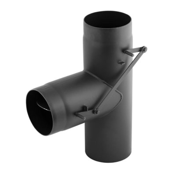 Тройник 90° с двойной шиберной заслонкой Ø 150 мм, одностенный, используется для соединения вертикальной и горизонтальной линии дымохода с возможностью ограничения потока дымовых газов с помощью двух встроенных шиберных заслонок. Изготовлен из черной стали толщиной 2 мм, покрытой слоем термостойкой краски.