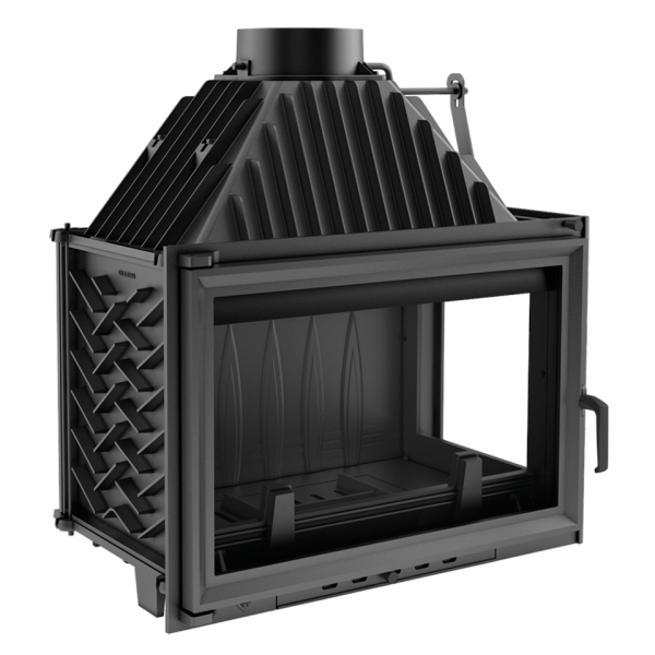 Высококачественная топка выполнена польской компанией KRATKI из серого чугуна. Топка имеет верхнее подключение к дымоходу и оснащена угловым стеклокерамическим окном выдерживающим нагрев в 800 градусов Цельсия. Корпус топки из высококачественного чугуна толщиной 8мм. Корпус усилен дополнительными ребрами, улучшающими теплонакопительные характеристики модели, а Элементы промазаны термостойким герметиком и закреплены болтами. Задняя стенка камеры украшена рельефами в виде языков пламени. Высокий дымосборник уменьшает выход дыма в помещение при открытии двери. Является своего рода буферной зоной между топкой и помещением. Ручка дверцы выполнена из стали. Открытие двери осуществляется подъемом ручки вверх. Для растопки используются только сухие дрова, излучающее натуральное тепло, абсолютно безопасно для человеческого организма. Регулятор подачи воздуха дает возможность экономично расходовать топливо. Воздух на горение дров подается через нижнюю часть топки. Ручка регулировки максимально сдвинутая влево, означает перекрытие подачи первичного воздуха, а ручка, сдвинутая вправо, означает, что подача воздуха максимально открыта. Высокая видимость огня при относительно низкой мощности и не больших размерах. В результате, при достаточно компактных габаритах топки, достигаются повышенный КПД и большая площадь обогрева. При этом продукция выделяется привлекательным сочетанием цены и качества.