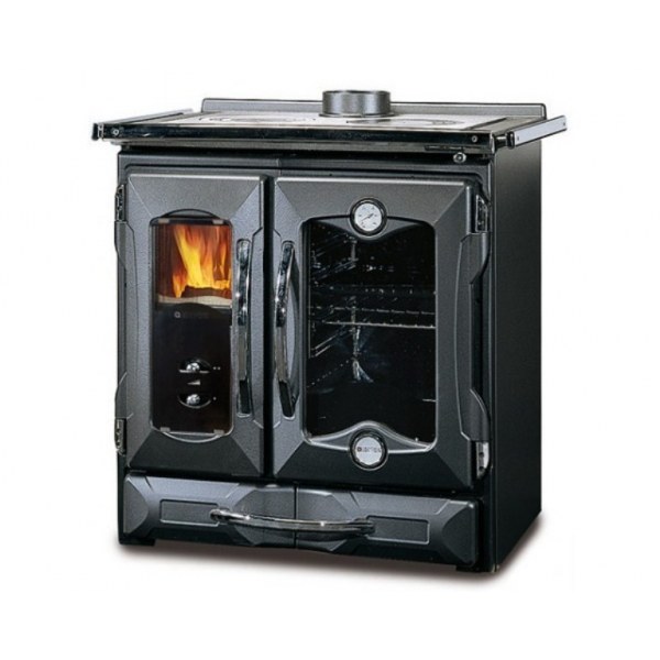Особенности: Внешняя облицовка эмалированным чугуном • Топочная камера из чугуна • Чугунная решётка • Дверца топочной камеры с двойным стеклом • Крупногабаритная эмалированная духовка 55 л • Дверца и варочная панель из чугуна • Ящик для загрузки дров
