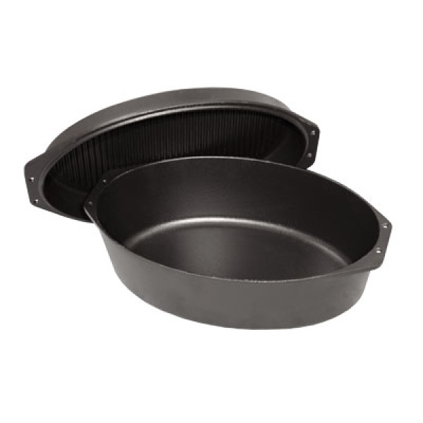 Крышка имеет глубокую овальную форму , благодаря чему ее можно использовать отдельно в качестве сковороды для запекания или обжаривания . Такая конструкция придает универсальность и позволяет готовить два блюда одновременно.