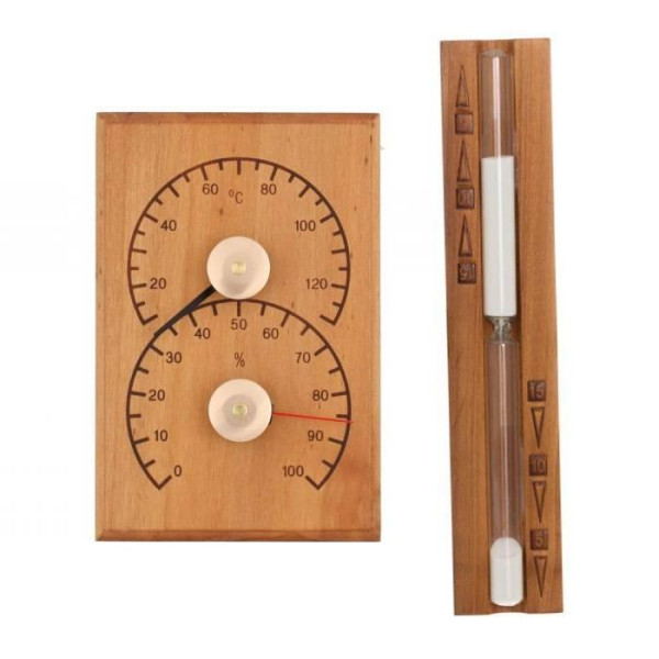 Набір аксесуарів від Rento — ідеальне рішення для поціновувачів банних традицій. До комплекту входять термогігрометр для точного контролю температури та вологості, а також пісочний годинник на 15 хвилин, який допоможе зручно відстежувати час перебування у парильні. Обидва вироби виготовлені з натуральної термообробленої вільхи, що робить їх не лише функціональними, а й естетично привабливими.