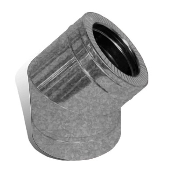 Коліно 45° 220/280 мм застосовується для повороту димоходу. Матеріал виготовлення внутрішньої труби - нержавійка, товщиною стінки 1 мм, зовнішня труба - оцинковка, товщиною стінки 0,5 мм. Теплоізоляція: базальтове волокно 30-35 мм. Всі елементи димоходу з'єднуються хомутами.