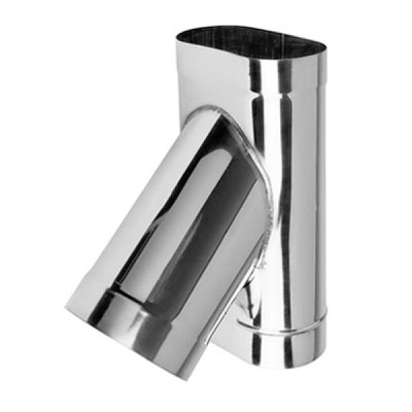 Трійник овальний 45° 110х220 мм з круглою врізкою Ø 200 мм використовується для з'єднання вертикальної частини та круглого димоходу з нахилом 45°. Виготовлений з нержавіючої сталі та є одностінним, товщиною стінки 0,6 мм, робочою температурою до 600 °С.